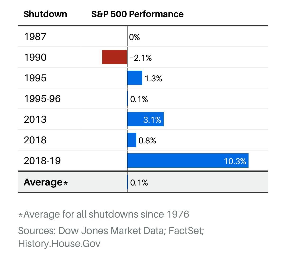 - The S&P 500 Index has averaged only a modest decline during (some of) these shutdowns, and rebounded once a resolution had been reached.