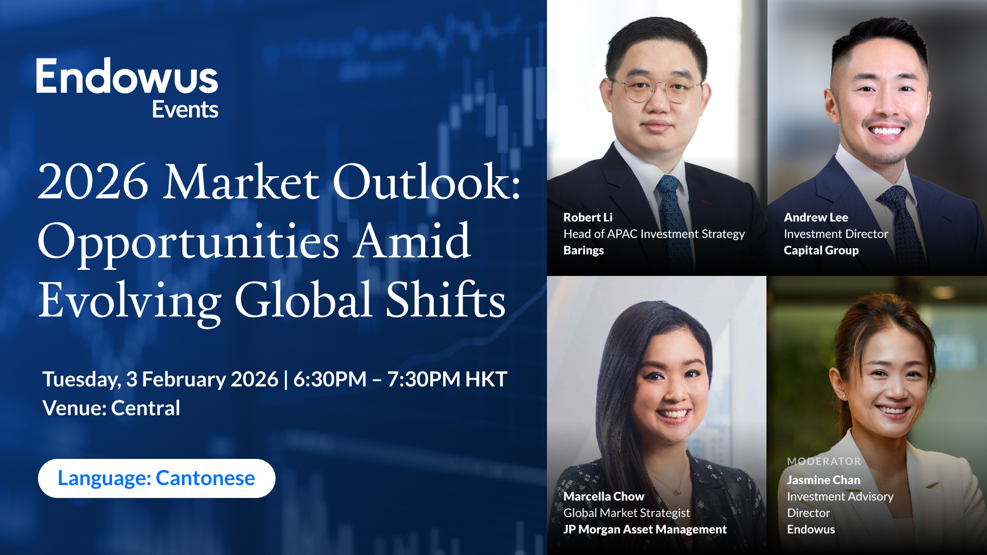 Endowus warmly invites you to an exclusive in-person event, 2026 Market Outlook: Opportunities Amid Evolving Global Shifts. Endowus’ Investment Advisory Director, Jasmine Chan will host a panel of investment experts: Robert Li, Head of APAC Investment Strategy at Barings, Andrew Lee, Investment Director at Capital Group, and Marcella Chow, Global Market Strategist at JP Morgan Asset Management, to discuss global market trends and asset allocation strategies for the year ahead.