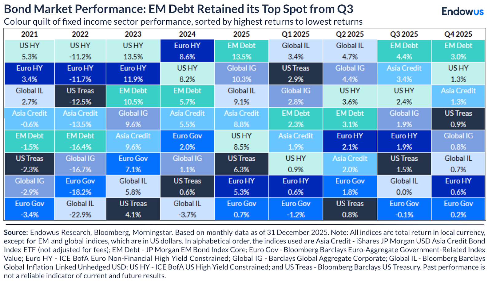 EM debt continues to be the bright spot for fixed income in 4Q25 following its strong performance in 3Q25.