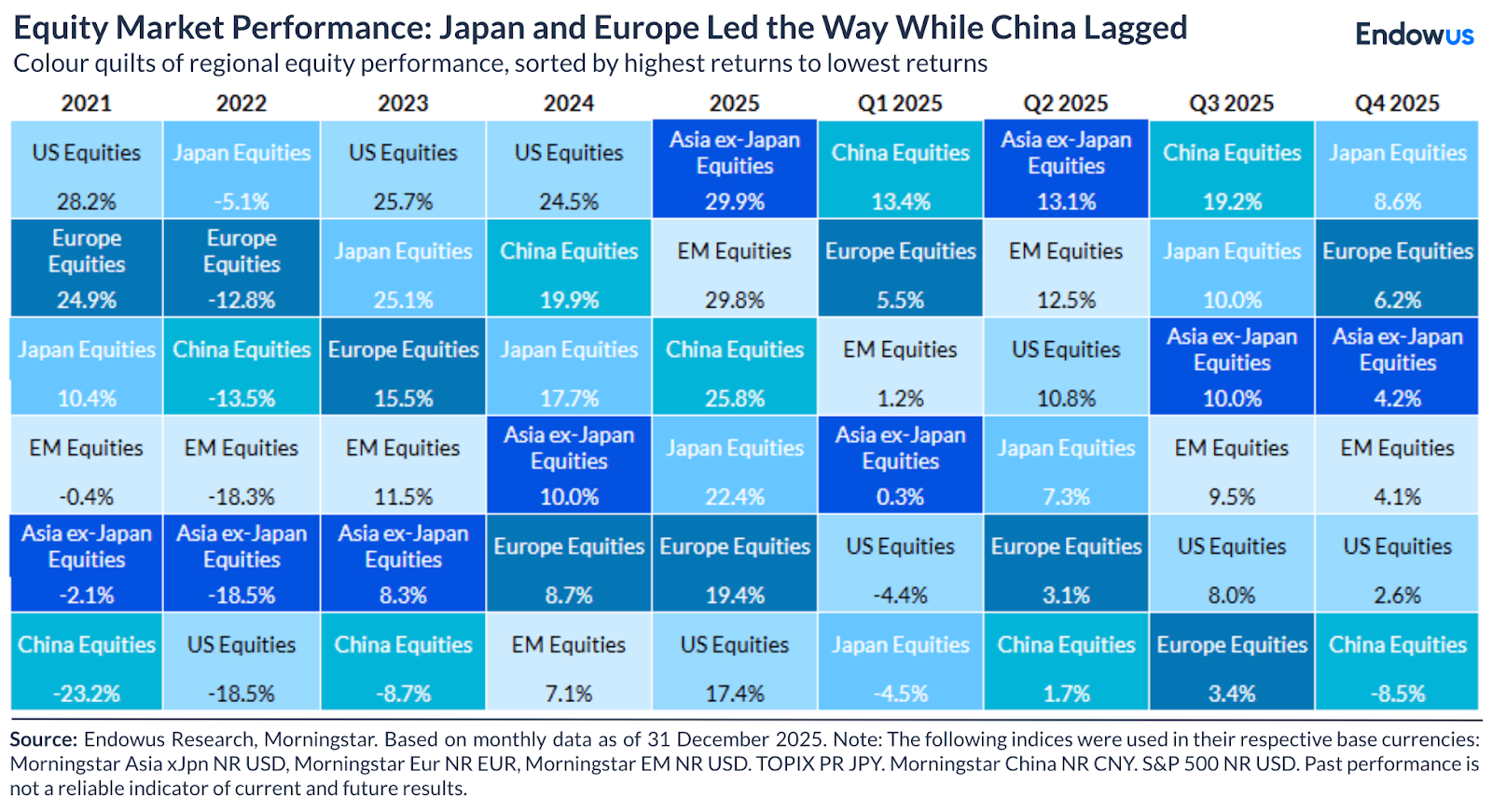 - Regional Highlights: South Korea and Japan surged 19% and 9%, respectively. Notably, 2025 marked a significant shift as Asia and Emerging Markets (EM) outperformed US equities by a substantial margin.