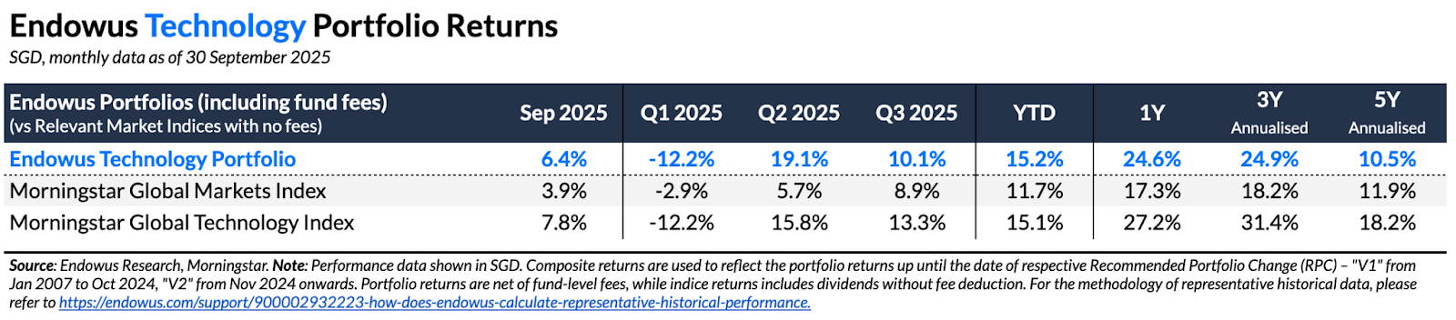 - Endowus Core 100% Equity Portfolio returned 9.5% in Q3 2025, on the back of the rally in equities driven by optimism around artificial intelligence and a rate cut by the US Federal Reserve. It outperformed the Morningstar Global Markets Index which returned 8.9% for the quarter.
