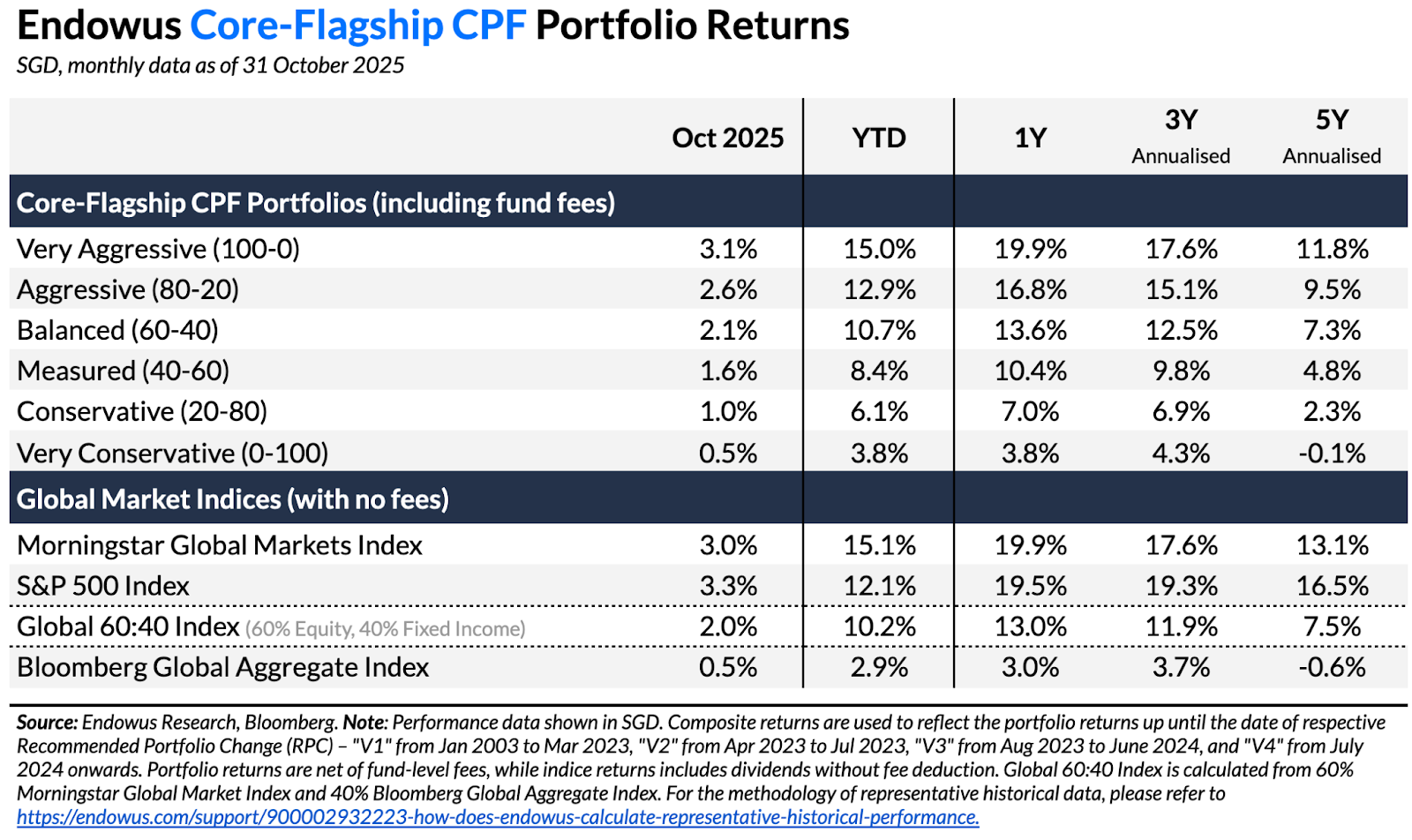 - The Flagship CPF 100% Equity Portfolio outperformed its benchmark in October due to its overweight to emerging market and US equities, which outpaced the broader equities market.