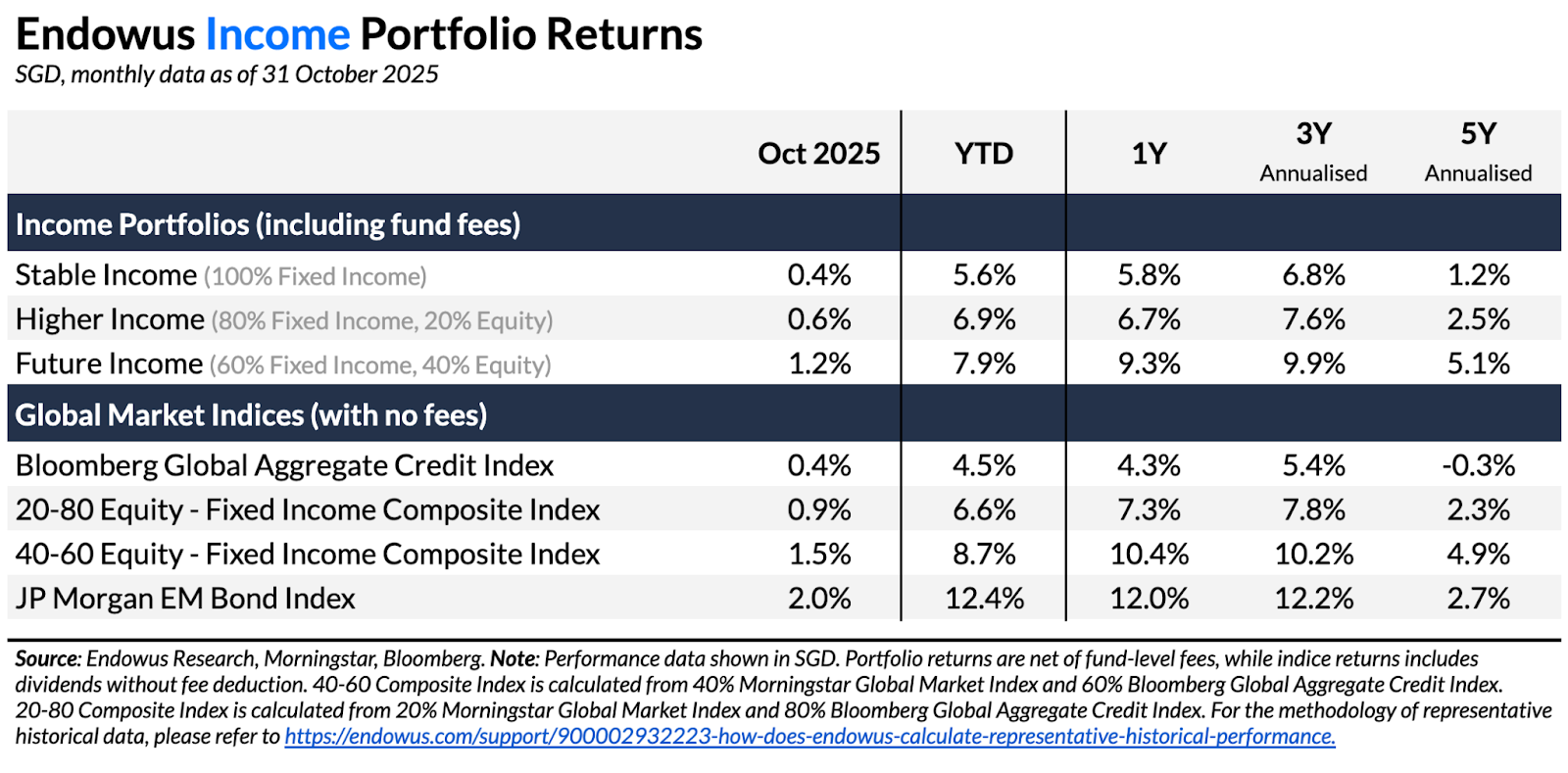 - All Income Portfolios generated positive returns in October. However, on a relative basis, the Stable Income portfolio performed in line with its benchmark, while Higher Income and Future Income portfolios underperformed their respective benchmarks.
