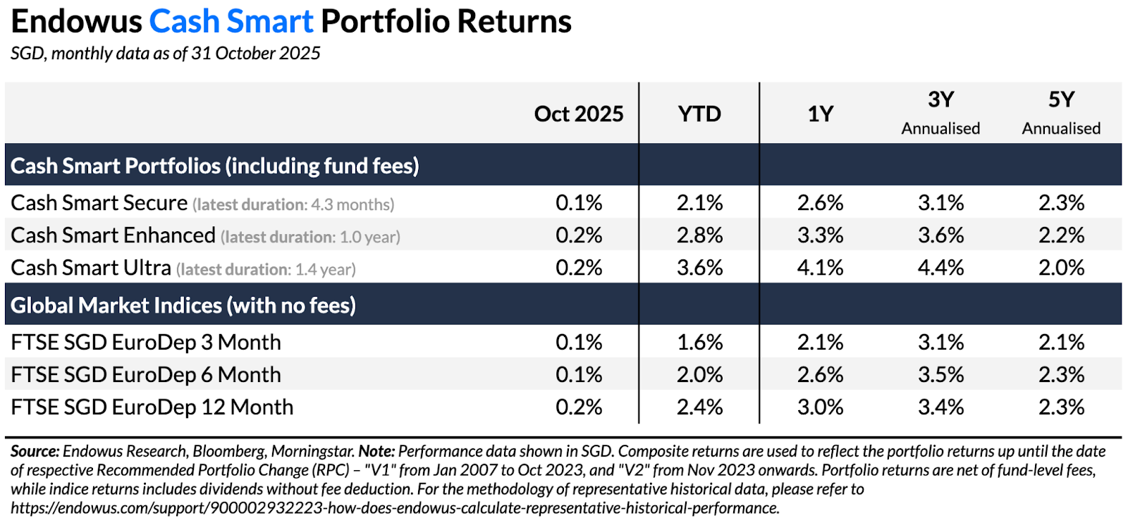 Please note: There has been a change in the benchmark due to the discontinuation of the 3-month SIBOR. The new benchmarks feature higher returns than SIBOR, but our Cash Smart Portfolios have tended to outperform them across various periods.