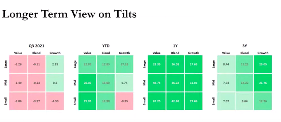 The numbers still remain quite strong from a three-year rolling basis, with growth outperforming value. The performance of small caps have also started catching up with large caps. In the past one year and year-to-date, value and small have outperformed the rest fairly meaningfully.