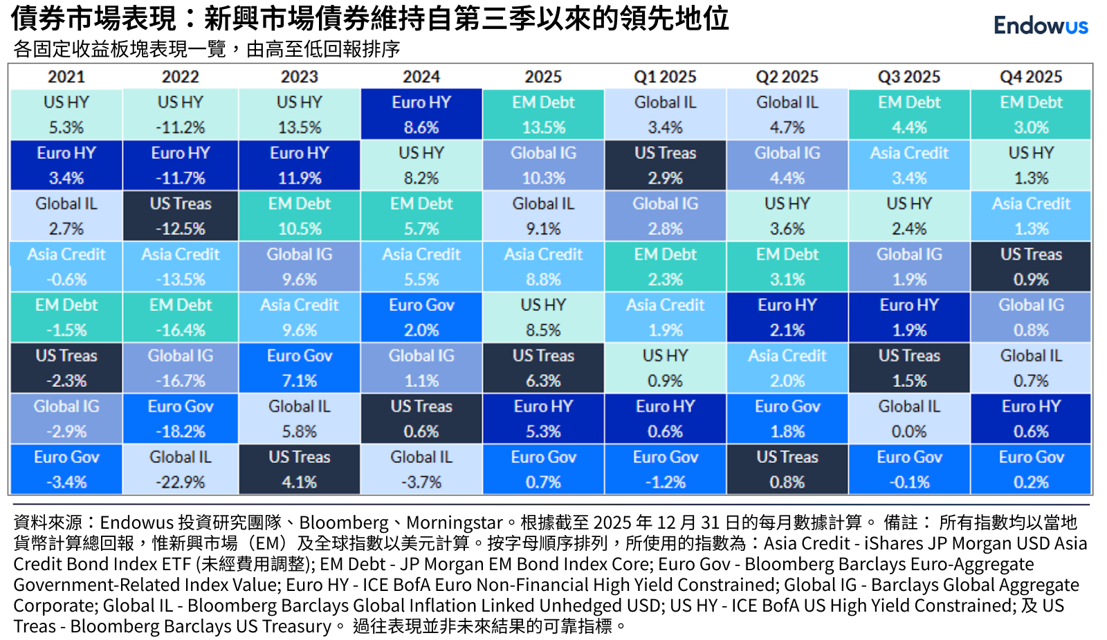 繼 2025 年第三季強勁表現之後,新興市場債券在第四季繼續成為固定收益市場的亮點。