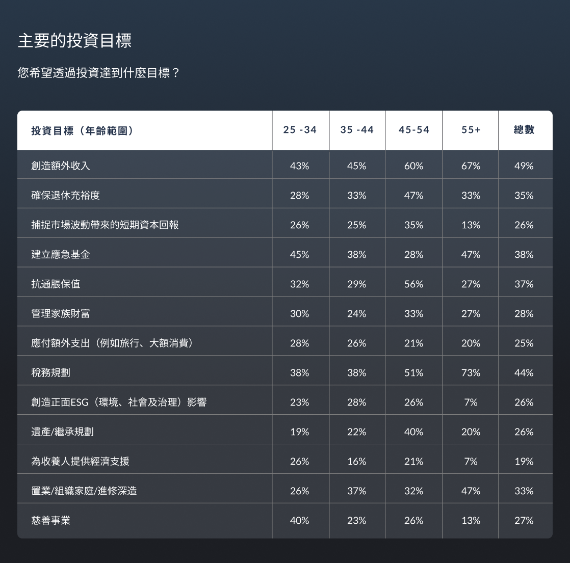 雖然安享退休依然重要,但不是唯一主導富裕投資者的投資決策。高達五分之三的投資者尋求更多元化的入息來源,特別是處於中年階段、正為退休做準備的群體。當中40%(即五分之二)將遺產與繼承規劃列為主要目標之一,為跨代財富轉移鋪路。