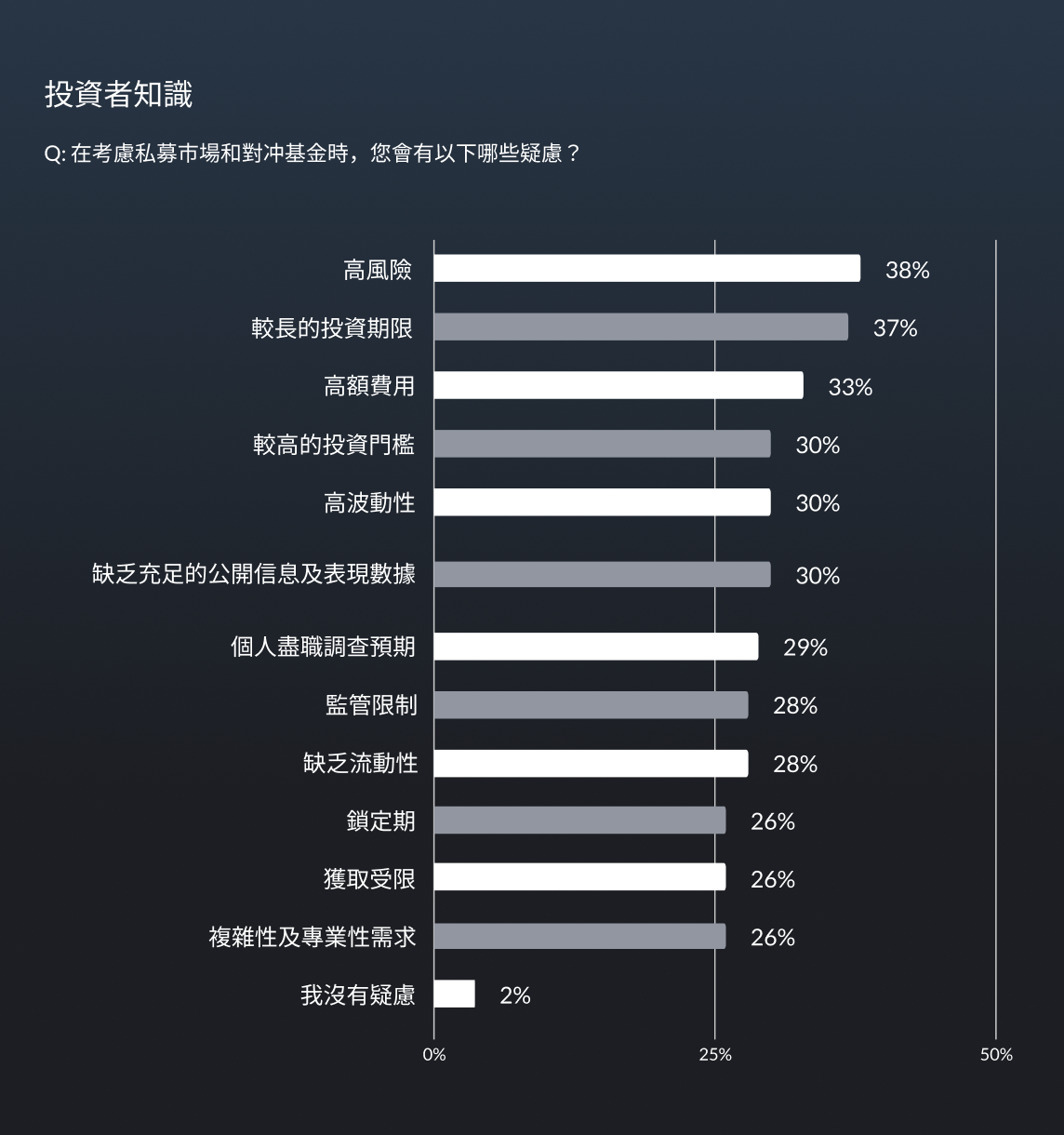 儘管對另類投資和私募市場投資前景樂觀,但潛在更高風險(38%)和較長的鎖定期(37%)等顧慮仍影響投資者的配置決定。投資者正尋求更清晰的框架來評估這些更複雜的策略,並期望獲得更多支持,例如降低最低投資門檻或獲取更多有關這領域的知識教育。