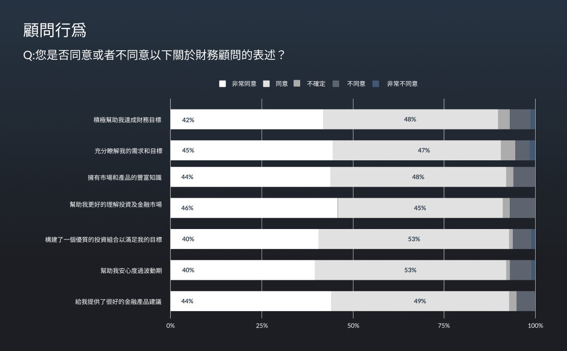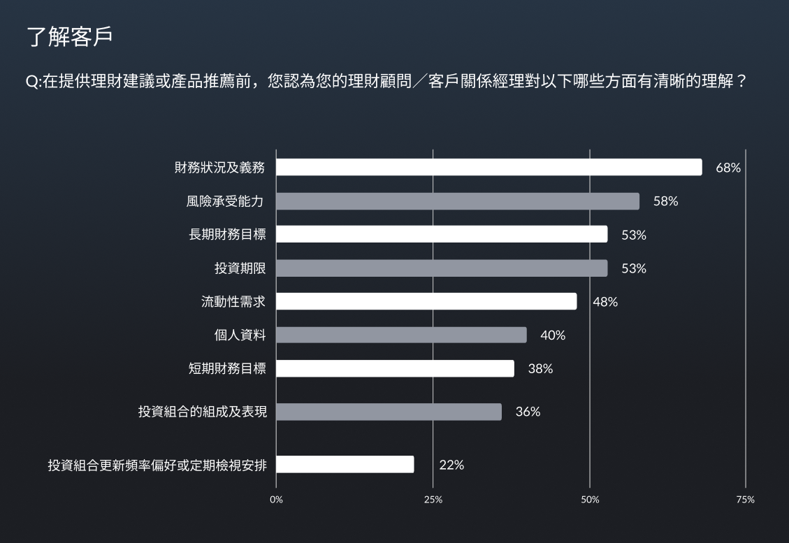 然而,投資者亦指出顧問在理解個人情況(40%)及釐清短至長期目標(38%)方面仍有不足。調查顯示,理財顧問有潛力將客戶的財務策略與他們的人生追求結合,特別是將複雜的策略轉化為清晰、可行的建議,以兩者「對齊」作為關鍵目標。